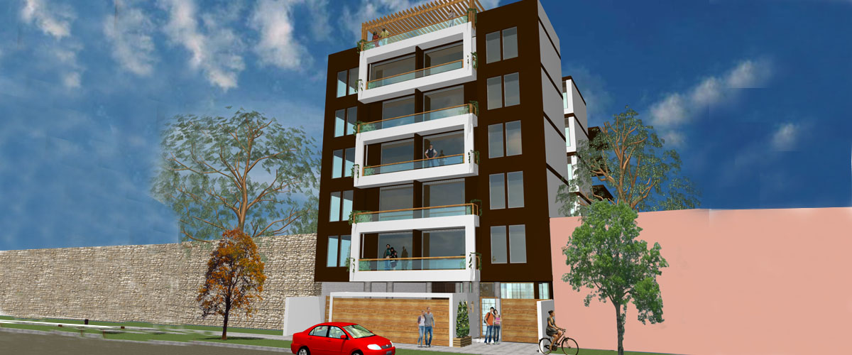 El proyecto considera un edificio de 17 departamentos (16 flats y un penthouse), en dos bloques en un total de 7 niveles y un sótano, con 19.30 mts de altura en el centro y en el fondo del terreno. Cuenta con 18 estacionamientos en total, haciendo un promedio de 1 estacionamiento por departamento mas uno para visita.